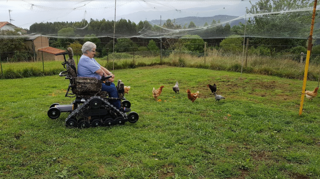 Nuestras sillas de ruedas de bipedestación son automáticas, por lo que no requieren un gran esfuerzo por parte del usuario a la hora de realizar la maniobra de ponerse de pie y hacen que su día a día resulte mucho más fácil, incluso en el campo.
